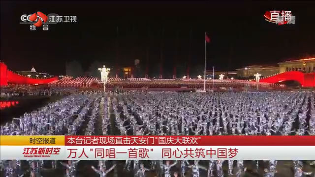江苏台记者毕然:在北京天安门广场,这里正在举行庆祝中华人民共和国成立70周年联欢活动,此时此刻天安门广场上流光溢彩、欢歌笑语,现场每一位观众都已经融入到举国欢庆、万众欢腾的热烈气氛中。大家怀着同样的自豪感、幸福感,共同庆祝这场“人民的节日”。