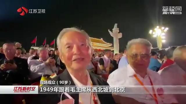在现场,一位90岁观众告诉记者,1949年他跟着毛主席从西北坡到北京,后来参加了开国大典,当时就在这个位置负责保卫工作;今天又正值新中国成立70年,也在这个位置来观礼,自己感觉到非常高兴。