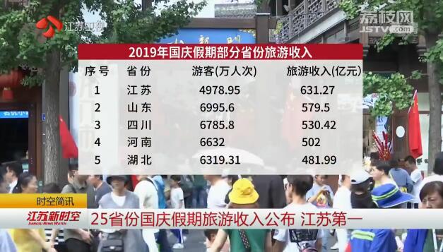 全国25省份国庆假期旅游收入今天公布,江苏以631.27亿元位居首位,是目前国庆假期旅游收入唯一突破600亿大关的地区。数据显示,江苏假日产品供需两旺,目前江苏5A级景区达23个,列全国第一,周庄古镇、中山陵、拙政园等传统旅游景区依然是游客首选,无锡水浒城的水浒故事汇,徐州的汉文化旅游节、汉服秀等文旅创意产品因彰显地方特色而备受游客青睐。