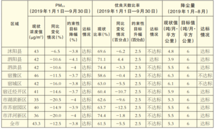 今天,宿迁市打好污染防治攻坚战指挥部办公室发布全市环境空气质量情况通报(详见表格)。通报显示,1月1日-9月30日,对照2019年全市环境空气质量改善约束性目标,各县区PM2.5浓度降幅全部达标;沭阳县、泗洪县、宿豫区、宿城区、宿迁经开区、市湖滨新区、市苏宿园区、市洋河新区优良天数比率升幅未达标;1月-8月,宿豫区、宿城区降尘量未达标。