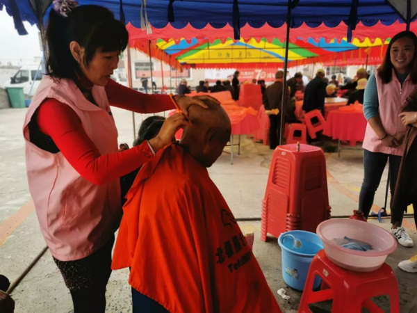 演出前,爱心企业请来理发师,专门为老人们理发。理发师十分敬业,毫不懈怠。