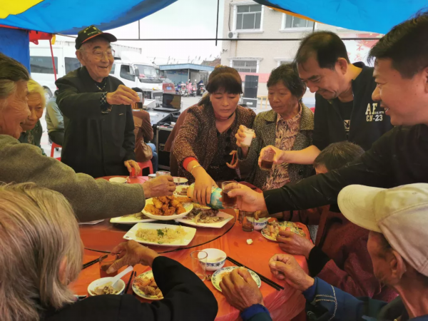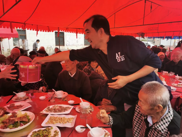 演出中途,近200名老人在村文化广场开开心心的吃上了节日大餐。宴席结束后,赞助企业还为每位老人准备了一份生日蛋糕。