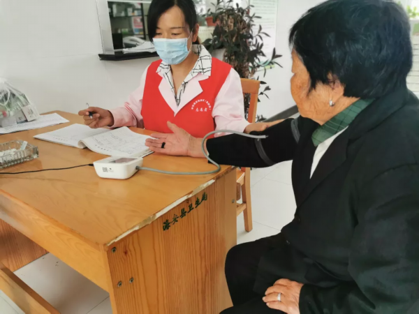村卫生服务站医生为老人们测量血压和血糖,真是服务到了家。