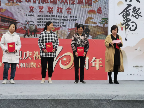 快板表演《评儿媳》后,村文明实践站评出的好媳妇儿居亚梅、吴冬梅、金田秀、赵成梅、彭桂云请上舞台,小朋友们为他们颁发荣誉证书和奖品。倡导尊老、敬老、爱老、扶老的优良传统。居亚梅还代表受表彰的好儿媳向全村妇女们发出倡议,呼吁所有周庄儿女对老人做到有住、有吃、有穿、有用、有花、有医、年节有祝福、卫生有保证,不让老人干重活,不让老人受气,不得打骂老人、虐待老人。
