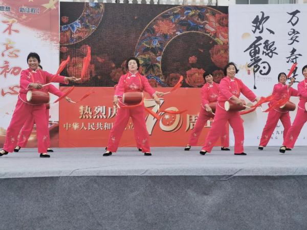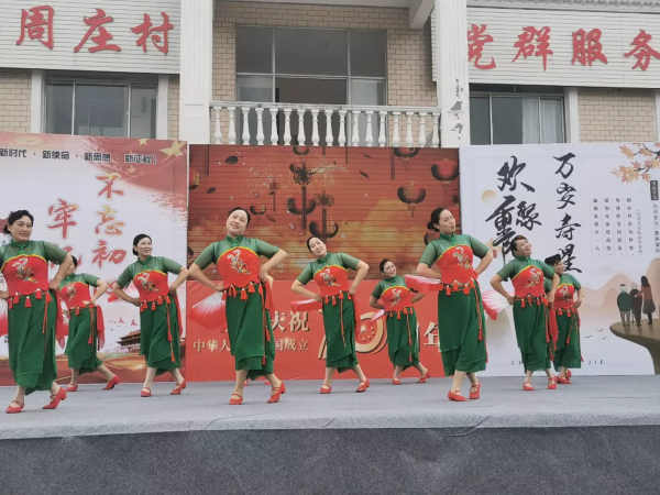 周庄村舞蹈队的“大妈们”不时将自编自演的节目穿插其中,为这么多的老人献演十分卖力。