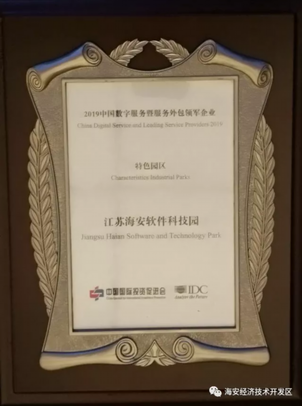 近日,国家商务部在杭州举办第十届中国国际服务外包交易博览会,海安开发区软件科技园被中国国际投资促进会授予“2019中国数字服务暨服务外包领军企业特色园区”奖。获此奖项的园区,全国仅3家,江苏唯一。
