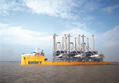 装载有3台大型桥吊的荷兰籍大件运输船“巴芬”轮,9日在南通海事局全程护航下,离泊南通惠生重工码头,顺利通过长江航道,踏上远洋之旅。