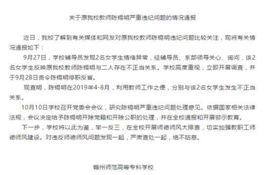 9月27日,学校辅导员发现2名女学生情绪异常,经辅导员、系部领导关心、询问,该2名女学生反映原我校教师陈锡明与二人存在不正当关系。学校高度重视,立即开展调查,并于9月28日责令陈锡明停职反省。