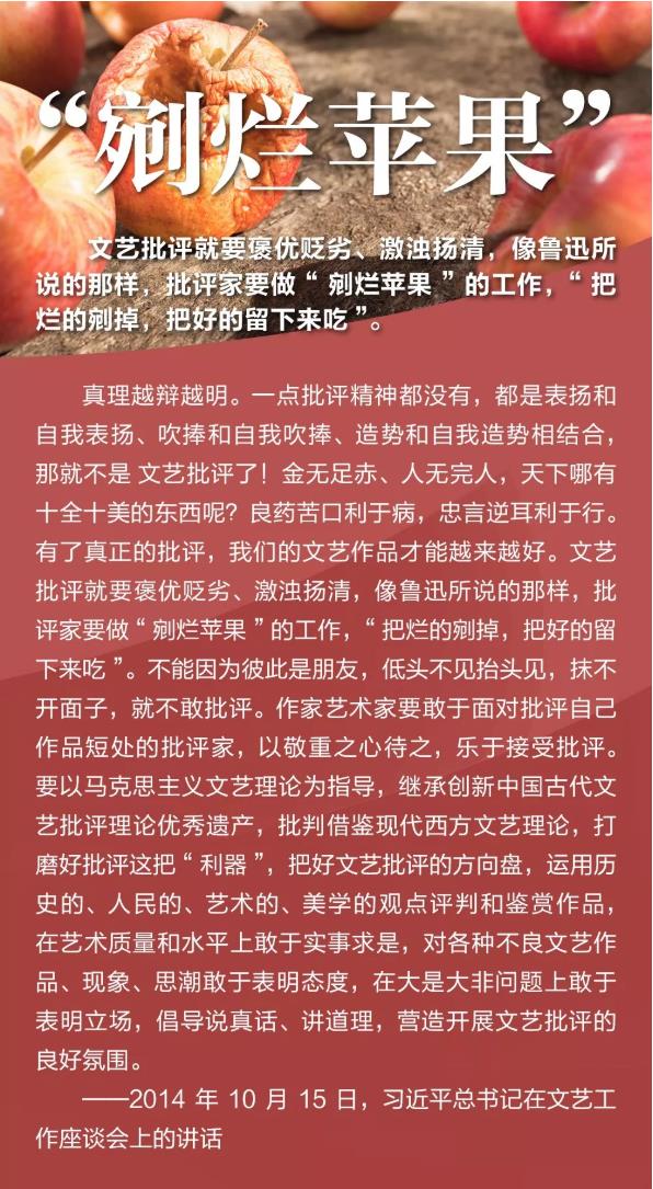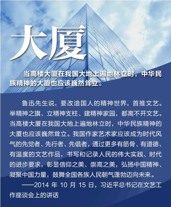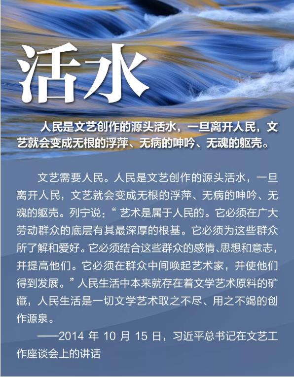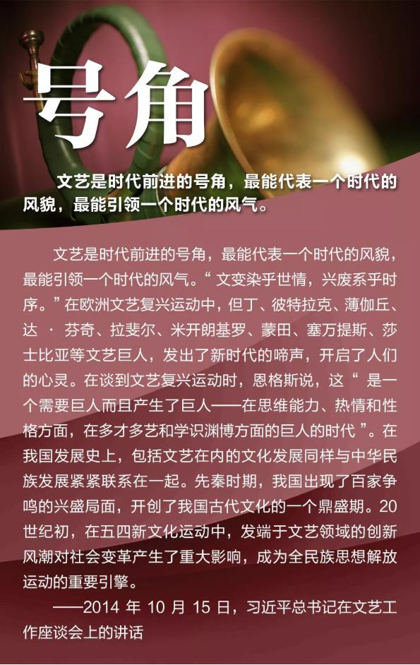 2014年10月15日,习近平主持召开文艺工作座谈会并发表重要讲话。谈及我国文艺繁荣发展的5个问题,强调实现中华民族伟大复兴需要中华文化繁荣兴盛,创作无愧于时代的优秀作品,坚持以人民为中心的创作导向,中国精神是社会主义文艺的灵魂,加强和改进党对文艺工作的领导。
