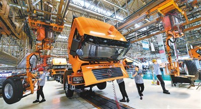 近年来,陕西汽车控股集团有限公司有1.8万人在西安缴纳社保,降费后每年可减少费用5000多万元。图为工人在陕汽总装生产线上作业。袁景智摄(人民图片)
