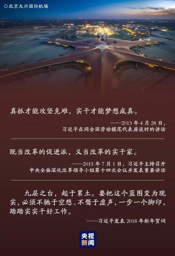 习近平总书记出席了当天的仪式,并宣布机场正式投运。习近平强调,大兴国际机场能够在不到5年的时间里就完成预定的建设任务,顺利投入运营,充分展现了中国工程建筑的雄厚实力,充分体现了中国精神和中国力量,充分体现了中国共产党领导和我国社会主义制度能够集中力量办大事的政治优势。奇迹是干出来的,社会主义是干出来的。共和国的大厦是靠一块块砖垒起来的,人民是真正的英雄。