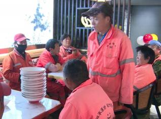 今天是环卫工人节,板面店通知了附近所有的环卫工人,并且专门挂起了横幅,买来了蛋糕,想给他们过个节。