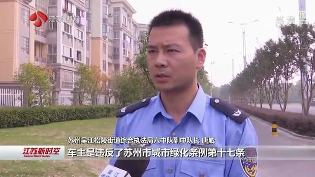 苏州吴江松陵街道综合执法局六中队副中队长唐威:车主是违反了苏州市城市绿化条例第十七条,任何单位和个人不得擅自占用城市绿化用地,可处以每平米占用500元至1000元行政处罚。所以我们按照占用8个平方,给予车主4000元行政处罚。