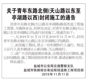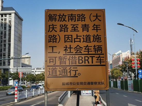 因盐城市区水环境治理工程需要,2019年9月20日至2020年1月20日占用解放路(世纪大道至大庆路)非机动车道和最右侧机动车道封闭施工。