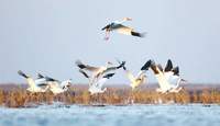据悉,东方白鹳属于大型涉禽,是国家一级保护动物,有“鸟界国宝”“鸟类大熊猫”之称。它们或矗立水面,一如回眸的剑侠;或临空展翅,如百鸟之王。在其周围,还共同栖息着数万只野生雁鸭和国家二级重点保护动物白琵鹭。不时可见,众鸟腾空,湖面掀起万马奔腾之声,随后可见一阵阵“鸟云”或左或右,刮起了鸟的旋风,盘旋在烟雨间,上演了湿地“嘉年华”。