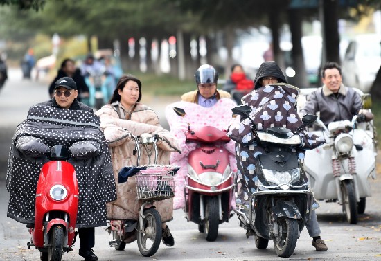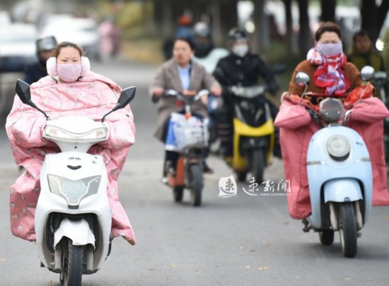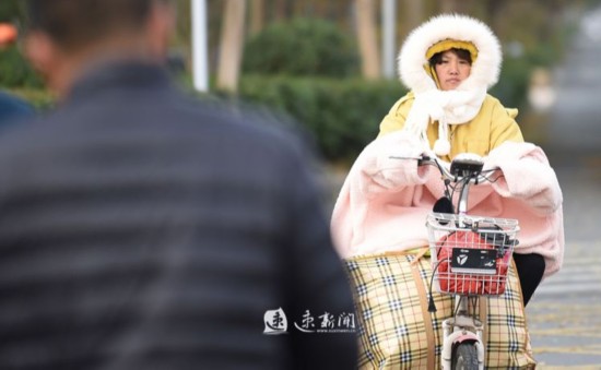11月18日上午,宿迁市区街头寒意浓,市民出行“全面武装”抗寒潮 。