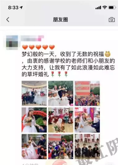 当天晚上八点半,新娘符梦倩发了一个朋友圈,向学校的老师们和小朋友诚挚感谢。