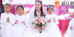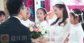 11月13日,婚礼当天实验幼儿园虹桥部的孩子们都来观礼了,符梦倩班级的6个女孩6个男孩分别做伴娘和伴郎。