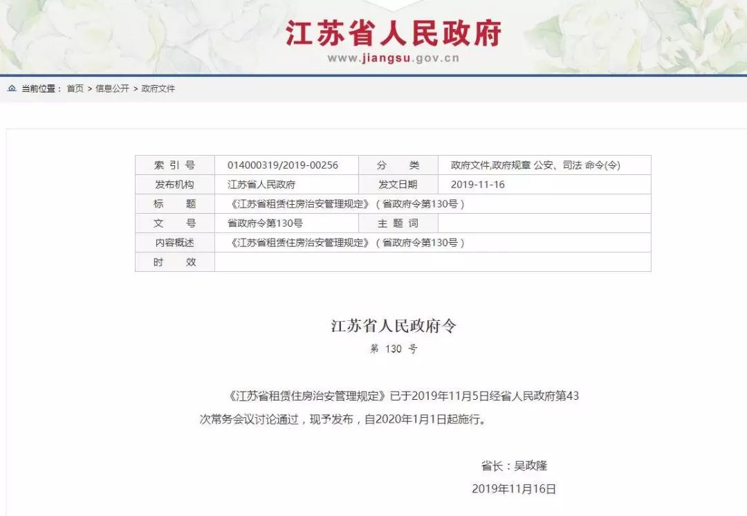 11月26日,江苏省政府公布了《江苏省租赁住房治安管理规定》,自2020年1月1日起施行。
