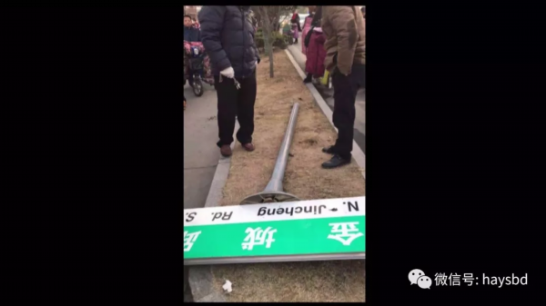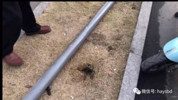 这是路边绿化带中一个路标指示牌。这个指示牌高达一米八,重量数十斤。当时,苏敏的头就被砸得鲜血直冒,但是,身高仅有一米五五的苏敏却咬牙将这个指示牌牢牢托住了。因为,她的身边就是吓坏了的孩子。