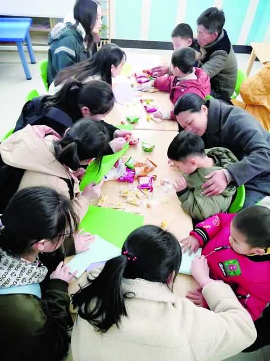 志愿者们教孩子折纸,分享小零食。有的孩子在纸上写字,然后展示给身边的志愿者。“你很棒!”志愿者摸摸孩子们的头鼓励道,然后剥开糖纸递到孩子们的嘴边。令人感动的是,孩子们却把糖递到了志愿者的嘴边。