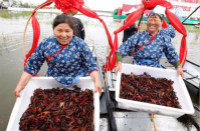 盱眙县黄花塘镇,连片稻渔综合种养示范基地已荣获国家级示范区。盱眙县政府工作人员介绍称,盱眙县立足做大做强“盱眙龙虾”品牌效应,把发展稻虾综合种养作为调优产业结构、改善生态环境、促进农民增收的重要举措来抓,目前盱眙县共有4000余户进行虾稻共生种养模式,虾稻共生达65万亩,虾稻共生种养,龙虾肥,稻米香,实现了“稻在水中长,虾在稻下游”的美丽图景。