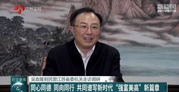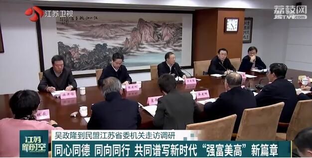 按照省委部署,12月31日下午,中共江苏省委副书记、省长吴政隆到所联系的民盟江苏省委机关走访调研、联谊交友、看望慰问,代表中共江苏省委、省政府向广大盟员致以崇高敬意和新年祝福。他希望民盟江苏省委坚持以习近平新时代中国特色社会主义思想为指导,在中共江苏省委坚强领导下,深入学习贯彻中共十九届四中全会和中共江苏省委十三届七次全会精神,进一步树牢"四个意识"、坚定"四个自信"、做到"两个维护",充分发挥人才荟萃、智力密集、联系广泛的优势,同心同德、同向同行,携手推动高质量发展走在前列,共同谱写新时代"强富美高"新篇章。