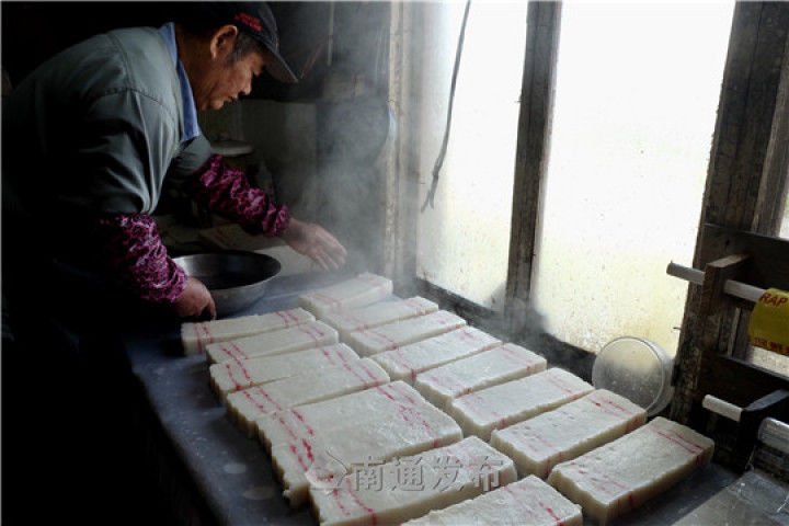 他介绍,蒸糕是南通人迎新年的关键环节之一,年糕更是新年待客的必备主食。要先把糯米磨成粉,再把磨好的粉和水、糖搅拌,拌均之后一层一层的撒到甑里,等蒸锅里的水烧开了,水蒸气穿透了,大概40多分钟的样子,年糕也就蒸熟了。“这蒸啊,也特别有讲究,当下面一层变得微黄时,就可以再撒上面一层。”顾汉章边说,边熟练地操作。不一会儿,伴随着缕缕蒸气,热乎乎的年糕就新鲜出炉了,浓浓的米香扑面而来,十分诱人。