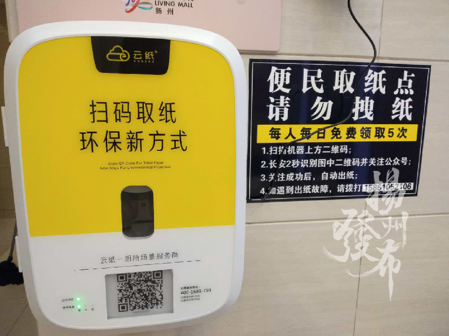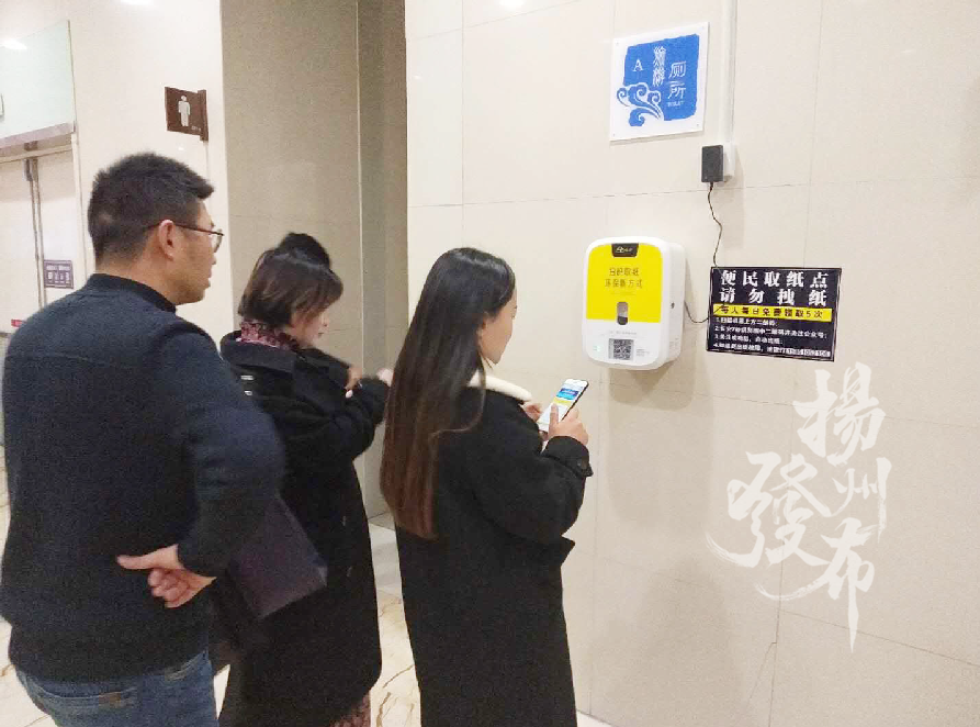 公共厕所内摆放厕纸,是一家单位、一座城市文明的象征。最近几天,市民在扬州明月湖公园健身和京华城、新城吾悦广场等一些大型商场逛街时,发现公厕内多出了扫二维码免费取厕纸的设备。