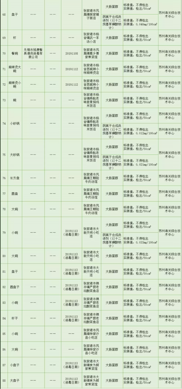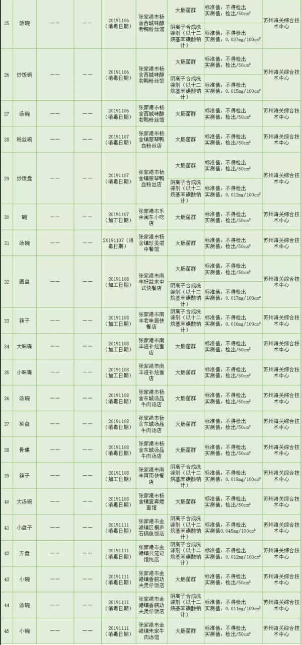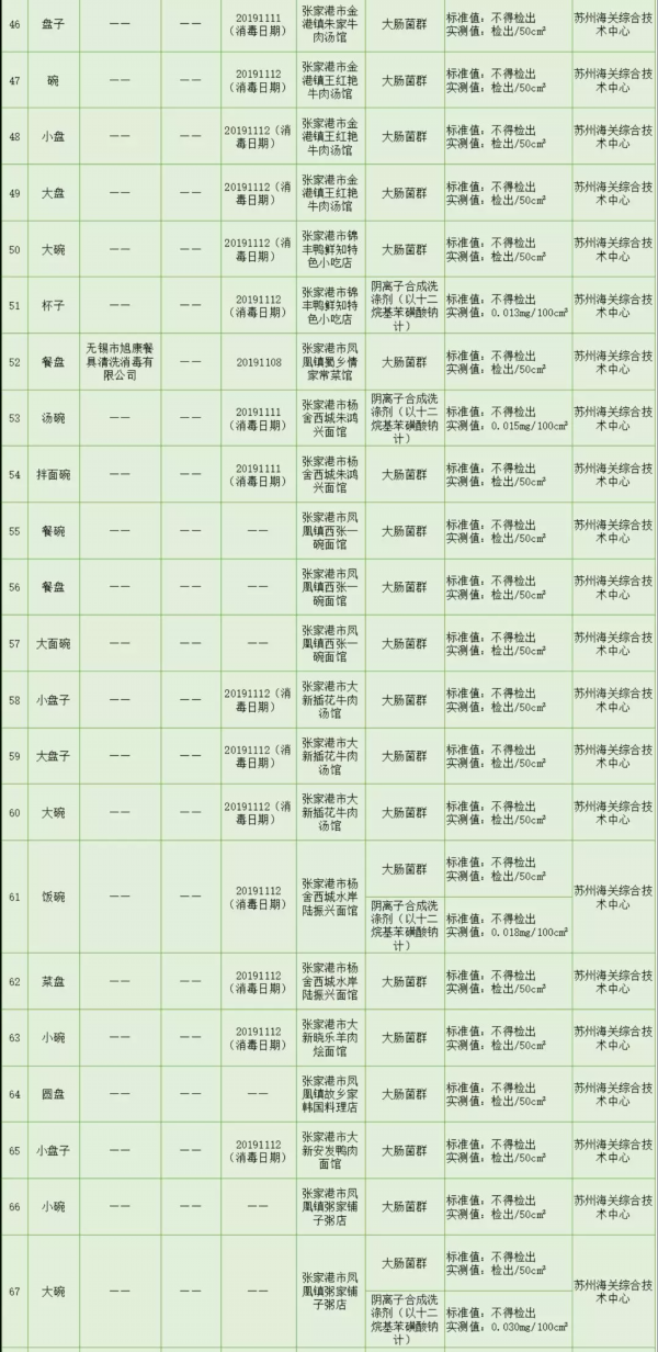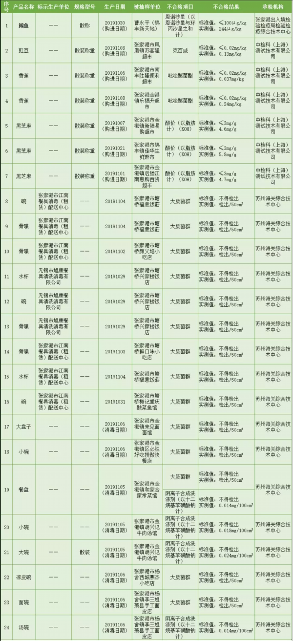 2019年11月,张家港市场监管对粮食加工品、调味品、蛋制品(再制蛋类)、水果制品(蜜饯)、方便食品(粉丝)和食用农产品(蔬菜、水产品、水果类、畜肉、鲜蛋、豆类、生干坚果和籽类食品)等食品品种及餐具进行了抽检。