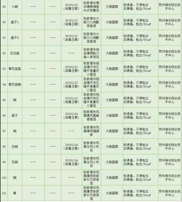 在此次抽查中,因大肠菌群造成的不合格率最高。其中,94批次餐具中有83批次检出大肠菌群。