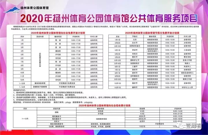 为进一步满足市民朋友日益增长的体育健身需求,加大公共体育场馆惠民开放力度,2020年扬州体育公园体育馆公告体育服务项目做如下安排: