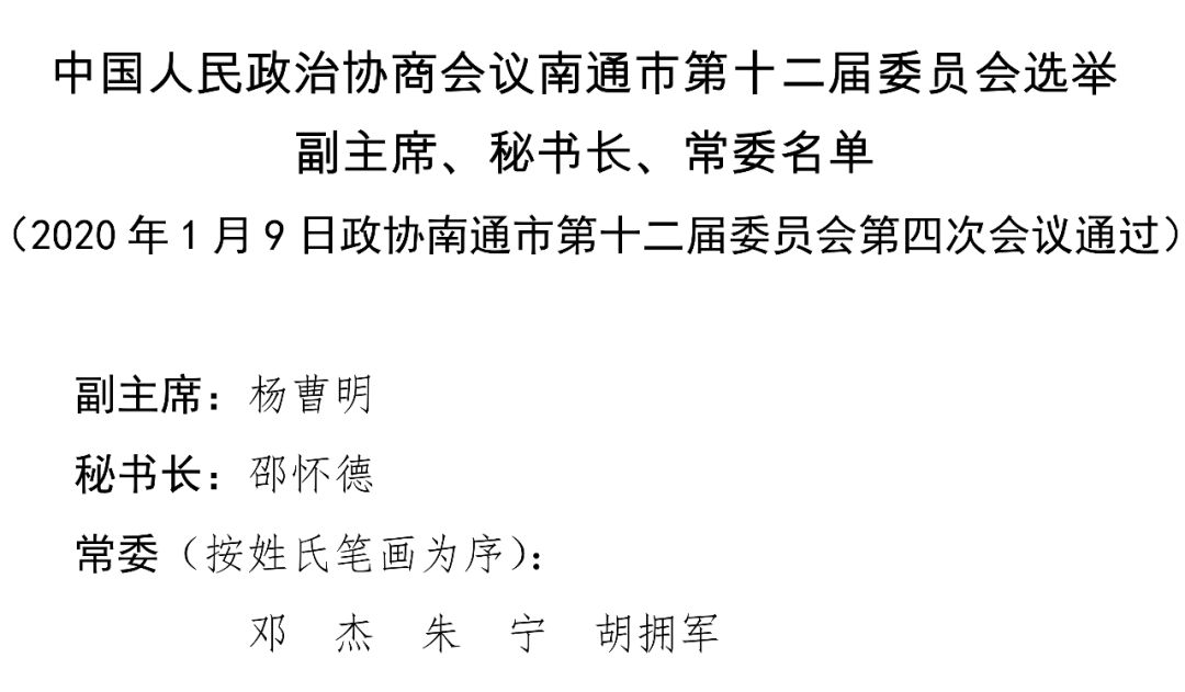 中国人民政治协商会议南通市第十二届委员会选举副主席、秘书长、常委名单