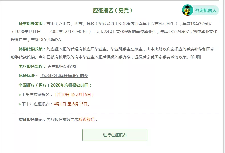 在这个页面中,会告知报名时间以及参军的政策说明,建议看后,点击“进行兵役登记”,迈出你军旅生涯的第一步吧!(★已经进行过兵役登记,有参军意向的可直接参加网上应征报名)
