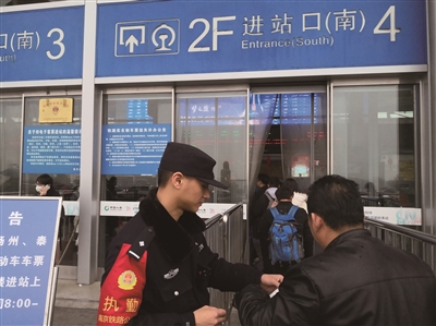 元月22日下午,南京火车站人头攒动,旅客们肩扛手提大包小包的行李。记者见到负责安保工作的派出所当班民警阮明路,他正在站前广场身着单警装备一边巡查,一边不停回答旅客的各种询问。据了解,像这样的询问,目前每个当班民警一天至少要接待400次以上。