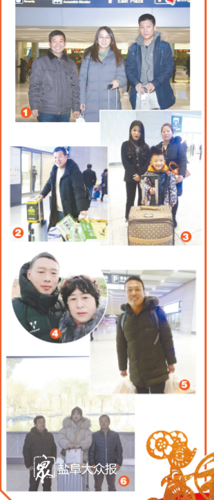 △①卞倩和丈夫肖梦阳(右)与父亲(左)在高铁站;②在山东工作的黄国玉乘坐动车回到家乡。;③卞文慧和家人在高铁站;④冯亚斌和妻子刘女士;⑤王慧带着礼物回家;⑥刘佳茗和父亲(右)、伯伯在高铁站合影。