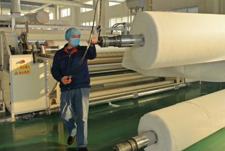 图为江苏华龙无纺布有限公司车间内,工人在生产口罩用无纺布。