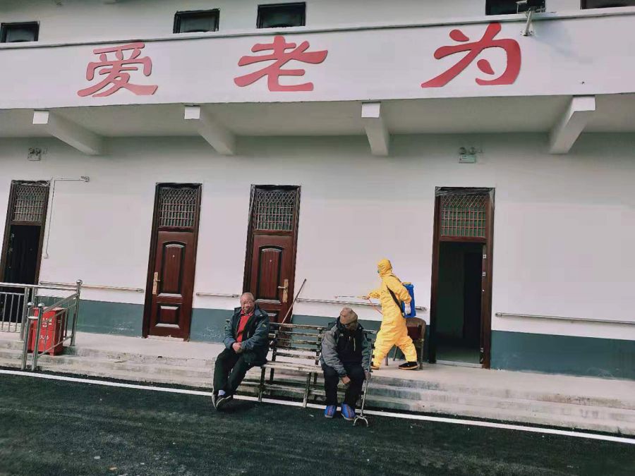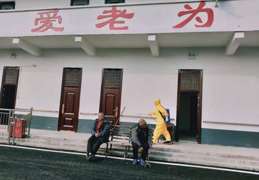 (上图穿黄色防护服的为姜广勇,在五段镇敬老院做消杀工作)