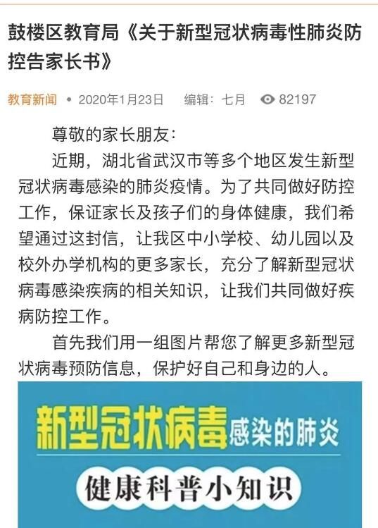 1月23日,全区范围内发布鼓楼区教育局《关于新型冠状病毒性肺炎防控告家长书》。