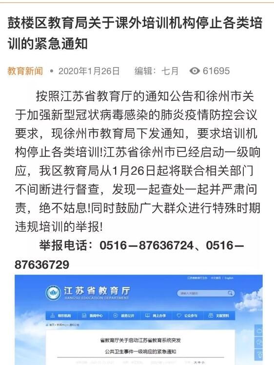 1月26日,发布《鼓楼区教育局关于课外培训机构停止各类培训的紧急通知》;发布《疫情面前,人人有责!——鼓楼区教育局致全区学生、家长和培训机构倡议书》。