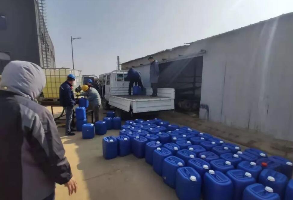 该批消毒液可以勾兑成3吨以上的84消毒液,解了医院疫情防控工作的燃眉之急。在医院卸货时,途径的好心人伸出援手帮助卸货。