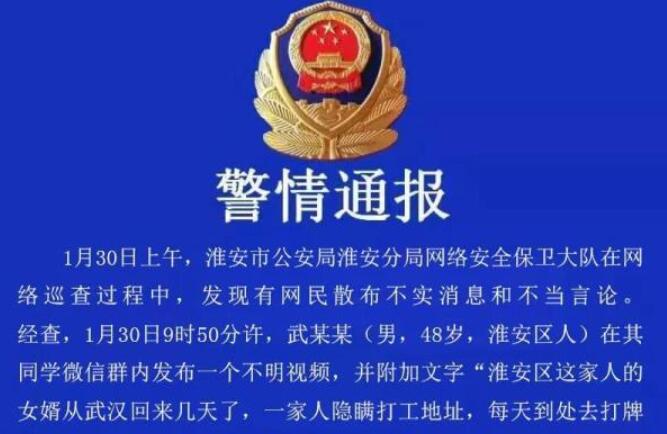 经查,1月30日9时50分许,武某某(男,48岁,淮安市淮安区人)在其同学微信群内发布一个不明视频,并附加文字“淮安区这家人的女婿从武汉回来几天了,一家人隐瞒打工地址,每天到处去打牌,今天发病了,邻居很愤怒,去砸他家”。经核实,该视频中的警情不是发生在淮安区,为虚假信息,武某某的行为涉嫌扰乱公共秩序。