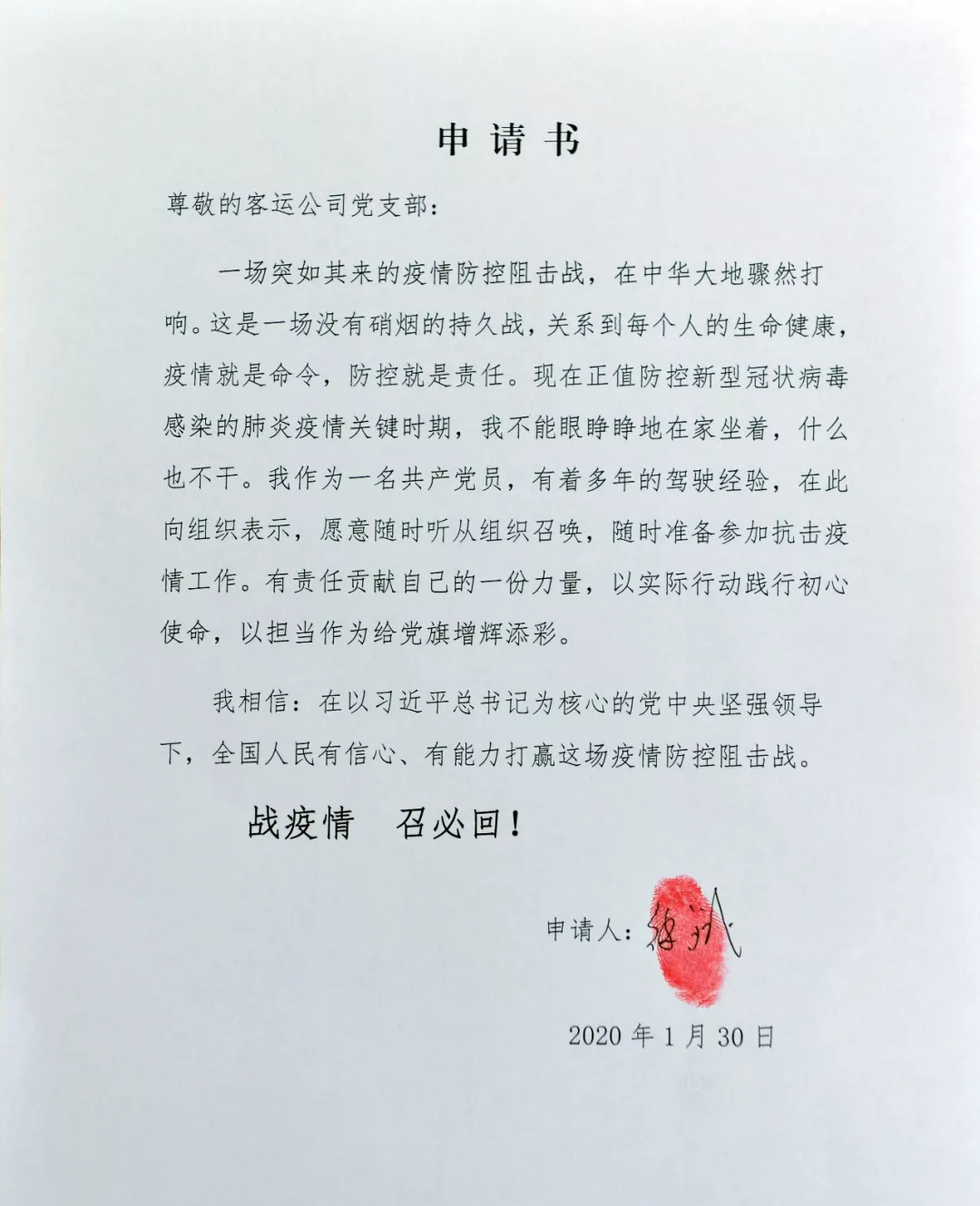 1月30日,洪泽区客运公司党支部收到了一封特殊的《申请书》,原来拥有24年驾龄的公司员工徐斌在1月30日公司客运班线暂时停运后,第一时间主动要求到疫情防控一线贡献自己的力量。