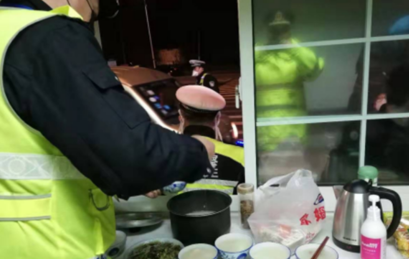 一位住在沙墩港大桥附近的望亭镇女性村民,看到工作人员在检测点顶着寒风一站就是几个小时,连水都没时间喝。她觉得十分心疼,于是晚上特意煮了一锅年糕粥送来。