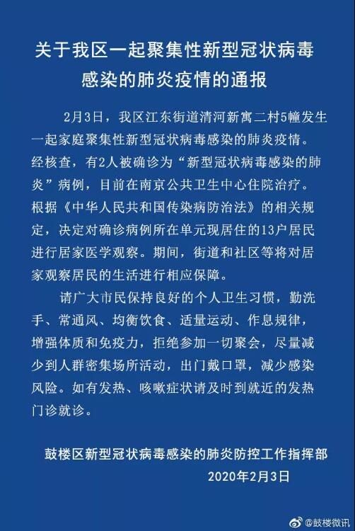 南京鼓楼区通报一起聚集性新型冠状病毒感染的肺炎疫情