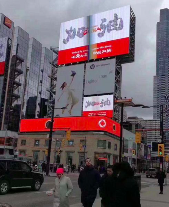 (加拿大多伦多街头给中国加油的巨幅标语)