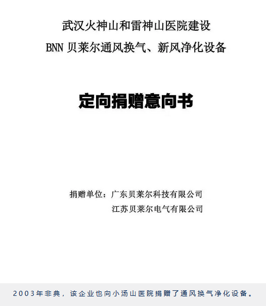 新型冠状病毒感染的肺炎疫情发生后,武汉疫情出现人传人,医院除了佩戴口罩、手套,使用杀菌消毒液,还要进行通风、换气及空气净化,这样对抑制疫情传播也至关重要。武汉新建雷神山和火神山两所医院,通风换气净化设备是必不可少的,为此位于淮安国家高新技术开发区,江苏贝莱尔电气有限公司,第一时间调动贝莱尔集团员工加班加点连夜与武汉当地政府、施工单位了解相关需求后,迅速组织向武汉正在紧急筹建的“蔡甸区火神山医院”、“江夏区雷神山医院”两所医院捐赠了医院建设所需的BNN贝莱尔品牌的换气扇、新风净化机等通风净化产品,共计320多台,价值11万多。