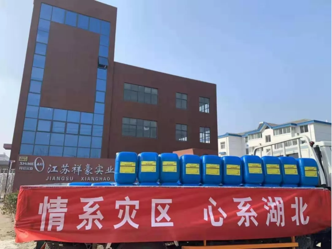 今天下午,江苏祥豪实业股份有限公司向淮安市第四人民医院捐献了二氧化氯消毒液1吨,价值人民币1.2万元。