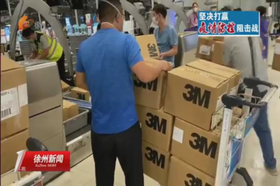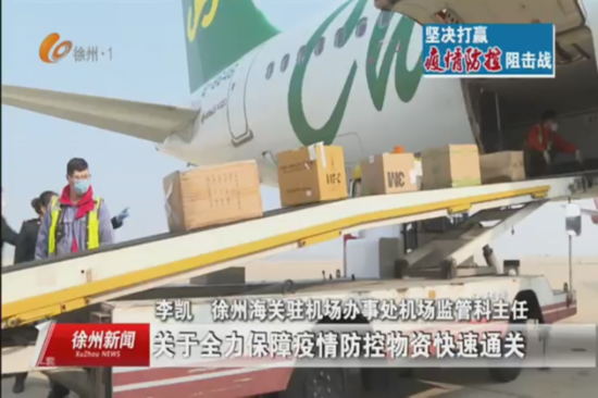 徐州海关驻机场办事处机场监管科主任李凯:“我们收到防疫物资保障消息后,徐州海关立即按照海关总署南京海关关于全力保障防疫物资通关的有关要求,开启绿色通道,提前申报登记放行的作业模式,确保该批物资零等待通关。”
