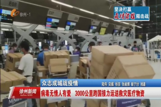 从1月29号下午接到海外华人捐赠医疗物资请求,到1月30号下午13:00从徐州发往武汉,不到24小时,旅行社、航空公司、机场、海关、邮政等多单位、多部门联手,曼谷、徐州、武汉3000公里跨国爱心大接力, 117箱3090件医用防护服物资顺利运往武汉抗疫一线。